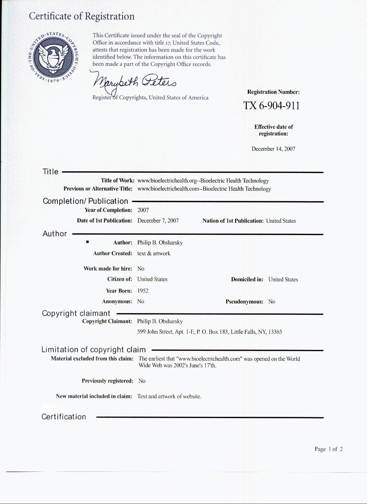 (This note has been added here on 2009's July's 01'st) For the virtual record, the above document is not exactly accurate. www.bioelectrichealth.com, of which www.bioelectrichealth.org is the direct continuation, was first uploaded to the World Wide Web in 2002's June. The date--2007's December 07'th--refers to the date that the application for the US Copyright Registration Certificate for the site was posted to the US Copyrights Office. The Web site has been in a continual steady state of growth from 2002's June to the present moment. Hopefully it shall be used to transfer an ever increasing supply of information and ideation (thought) centered around the very beneficial Technology of Bioelectric Health to an increasingly less anionic public, so we can survive the wide spread MADNESS (Mineral Attrition Disorders, Necessitating Electrical Supplementation Somehow) present in the WORLD (Whole Ordered Reality Layers Domain).