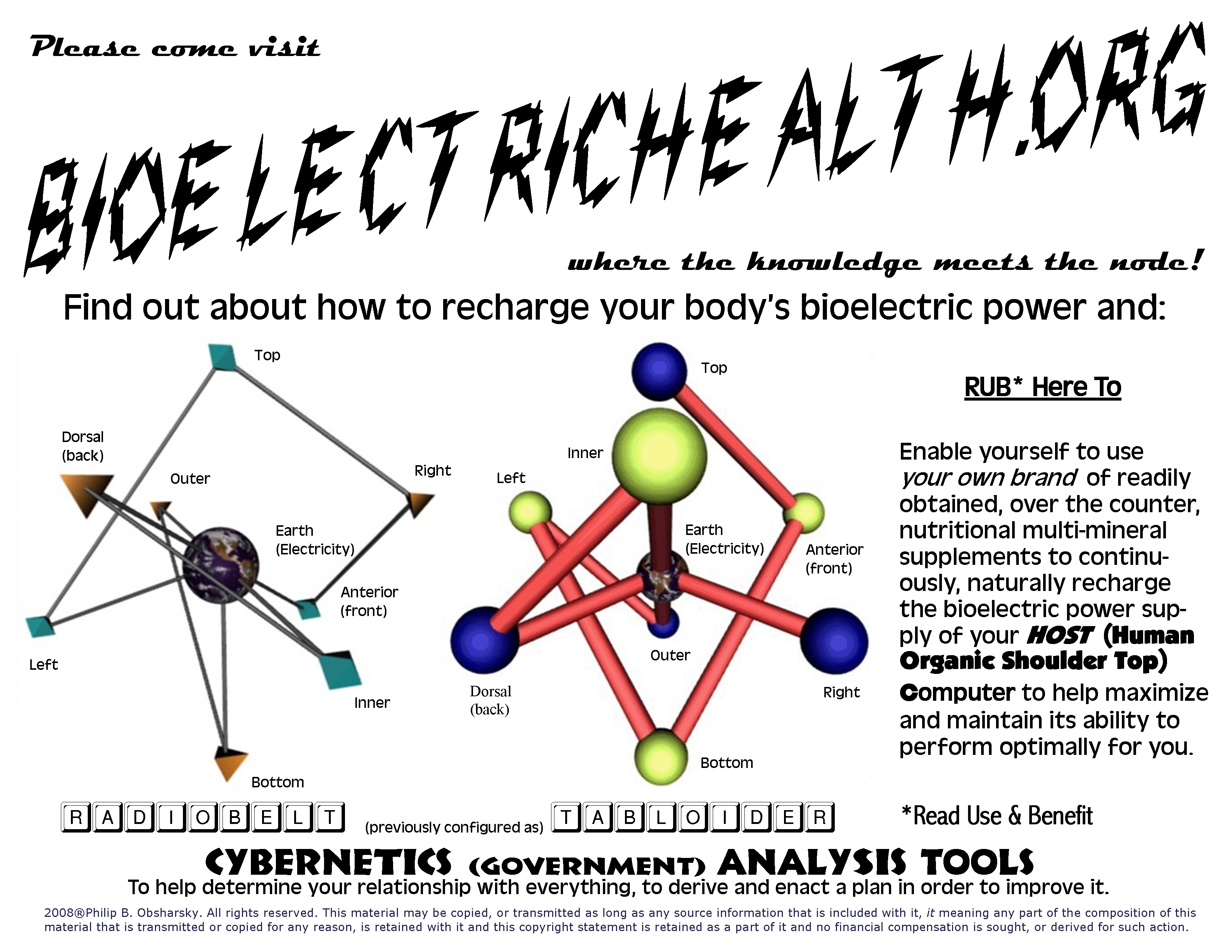 The following is the latest Bioelectrichealth.org business card. If you think that it is a good idea, please download paste, print this .jpg image from a business card application. Then neatly cut the separate cards out of the pages that you've printed and leave them around where people might see them. They might do so and decide to find out what the information is about and use the cards to access the URL easier than trying to remember it, thus increasing the chances that they actually get the information.