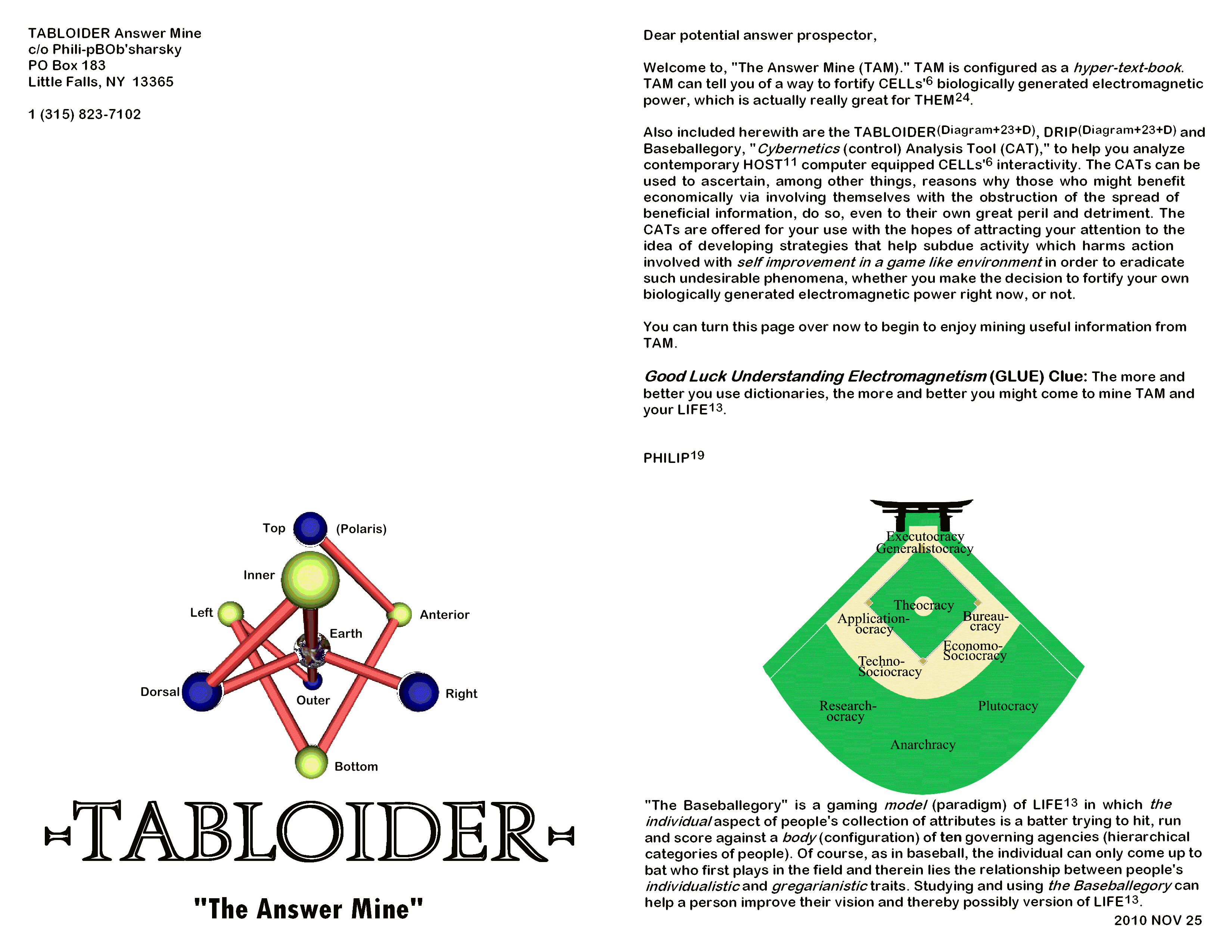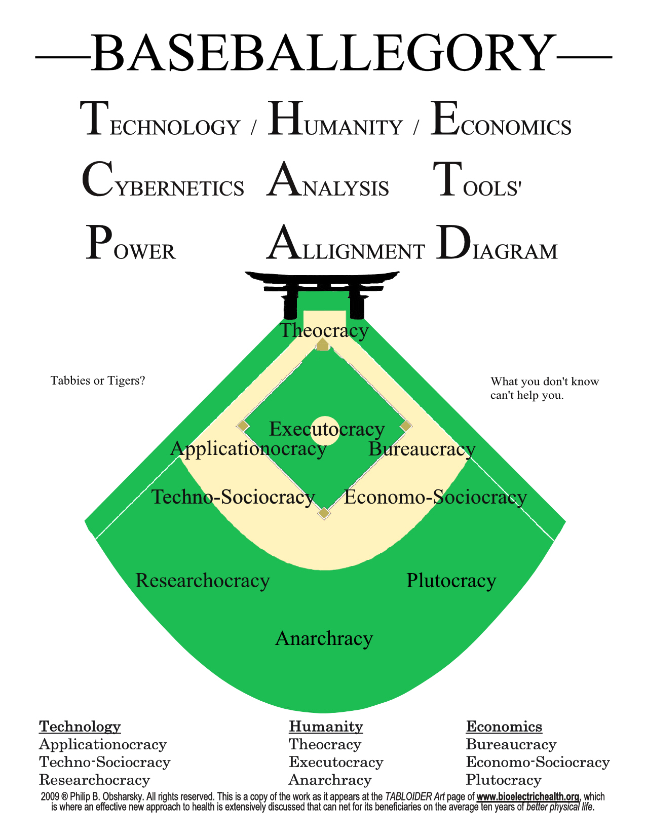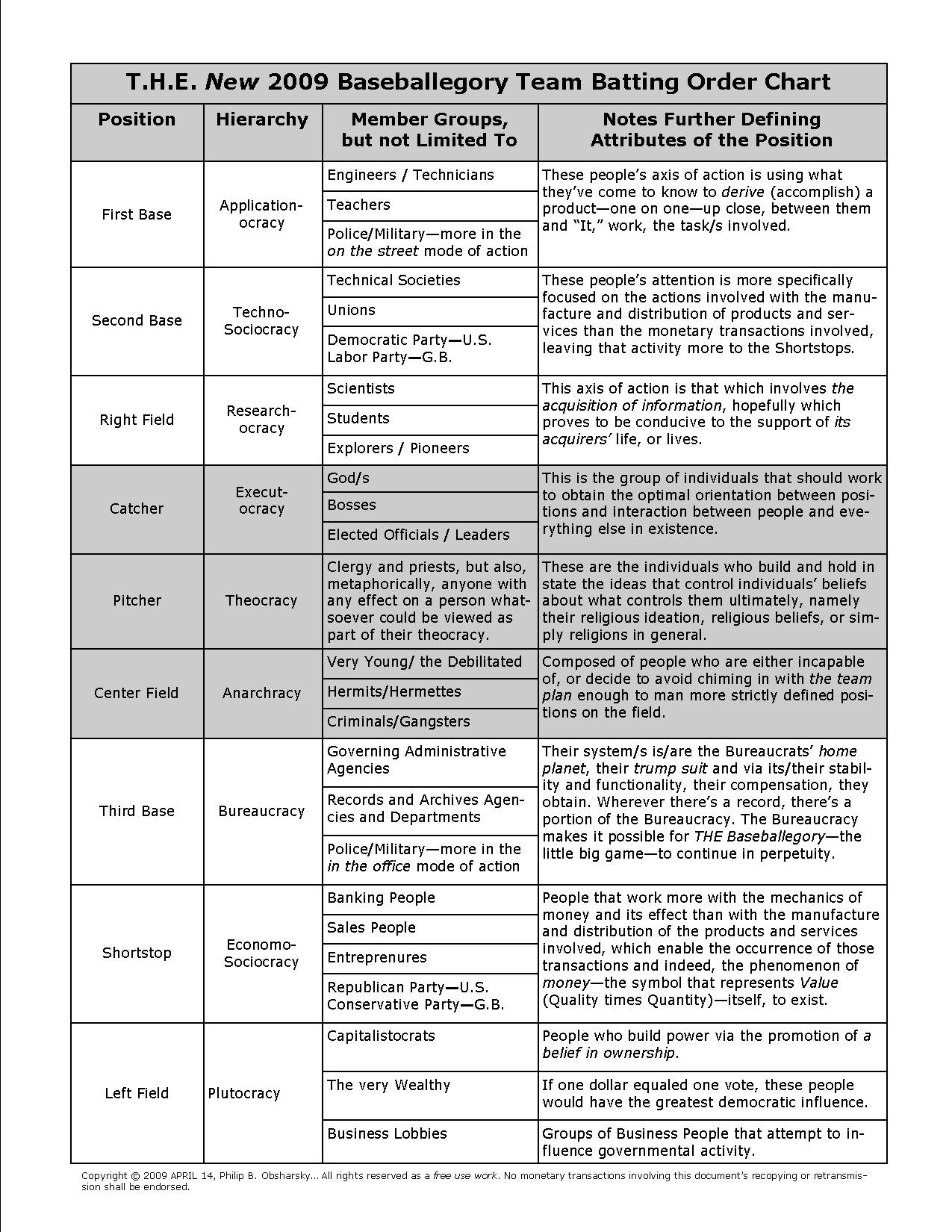 T.H.E. New 2009 Baseballegory Team Batting Order Chart {The Baseballegory [Baseball + Allegory (a symbolic representation)] Legend} The Baseballegory is the most articulated (intricate) version of the TABLOIDER's CATs, which has been developed to date. Maybe you could use it to help you analyze your own game plan, to help you derive the best one that you can. In the updated (new) version, the Theocracy was moved to Pitcher and the Executocracy was moved to Catcher. Details posted at the TABLOIDER Art page...